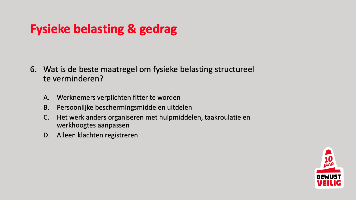 De Bewust Veilig-quiz bestaat uit 27 vragen over diverse veiligheidsonderwerpen. Verschillende fysieke gevaren komen aan bod, maar er worden ook vragen gesteld over bijvoorbeeld gedrag en sociale/psychologische veiligheid. Wil je meer lezen over al deze onderwerpen? Bekijk dan ook de